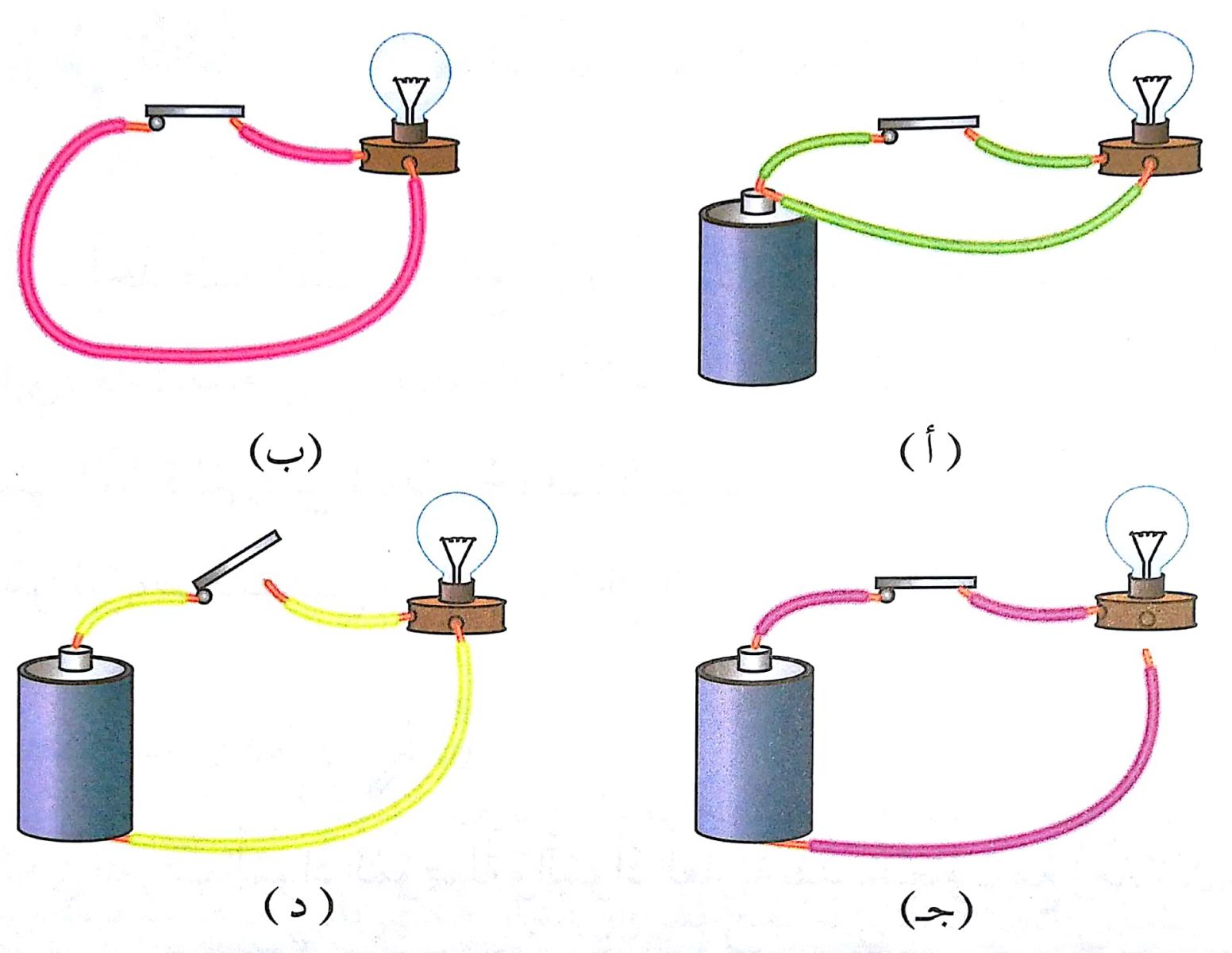 يمثل الشكل أربع داراتٍ كهربائيةٍ، هي (أ، ب، ج، د)، رُكب كلٌّ منها بطريقةٍ غير صحيحةٍ، اكتشف الخطأ، وصححهُ، لكي يضيء المصباح، ثم دوّن ذلك في الجدول.